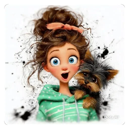 Menina com cabelo castanho e um laço rosa, usando uma blusa verde listrada, com um cachorro castanho ao lado, parecendo surpresa.