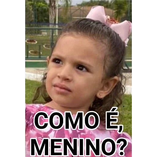 Menina com expressão curiosa, cabelo castanho e um laço rosa, ao ar livre. 'COMO É, MENINO?'