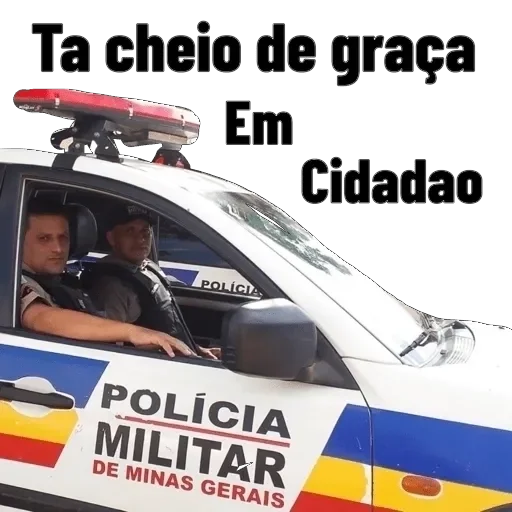 Um carro da polícia militar com dois homens dentro, um ao volante e outro ao lado, com texto 'Ta cheio de graça Em Cidadao' em preto acima do veículo. A viatura tem as cores da bandeira de Minas Gerais.