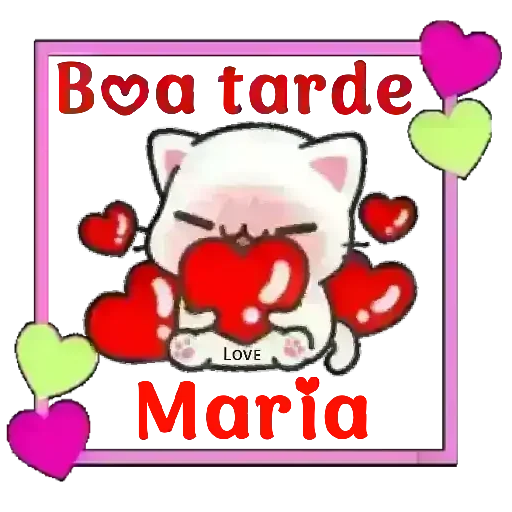 Um gato branco fofinho com olhos fechados e bochechas rosadas, beijando um coração vermelho grande, cercado por corações coloridos e texto 'Boa tarde Maria'.