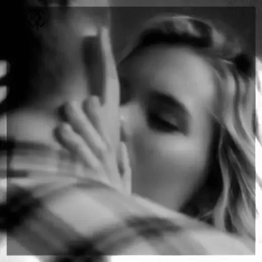 Um casal se beijando em preto e branco, com a mão da mulher no rosto do homem.