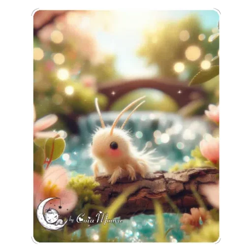 Um pequeno inseto fofo com antenas e olhos grandes sentado em um galho sobre um riacho, cercado por flores cor-de-rosa e vegetação, com uma ponte ao fundo.