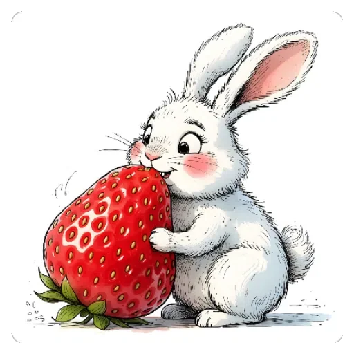Um coelho branco com orelhas rosadas e bochechas cor-de-rosa está sentado ao lado de uma morango gigante, com as mãos segurando o fruto.