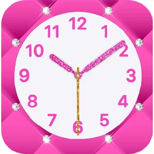 Um relógio de parede rosa com números e ponteiros decorados, em um fundo com detalhes brilhantes.