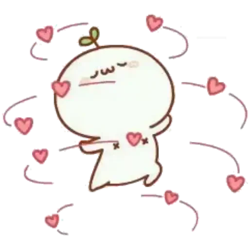 Um personagem de desenho animado com olhos fechados e bochechas rosadas, cercado por corações vermelhos.
