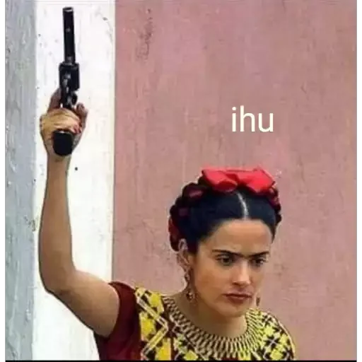 Uma mulher com um vestido colorido e uma faixa vermelha no cabelo segura uma arma de fogo com a mão direita levantada. A palavra 'ihu' aparece acima dela.