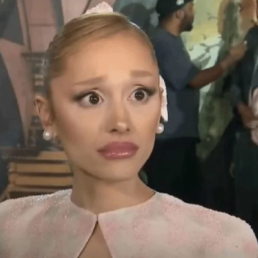 Rosto de uma mulher com expressão surpresa, fundo desfocado com pessoas.