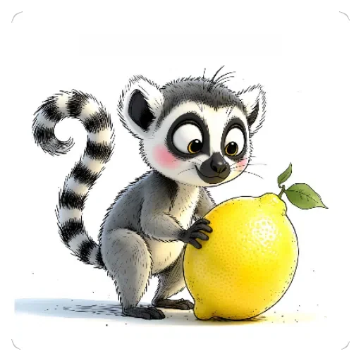 Um lêmure fofinho com olhos grandes e bochechas rosadas está ao lado de uma fruta amarela, com folhas verdes.