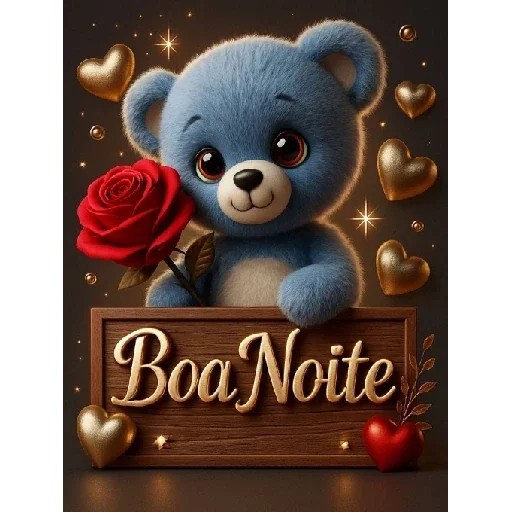 Um ursinho azul com uma rosa vermelha na pata, cercado de corações dourados e texto 'BoaNoite' em uma placa de madeira.