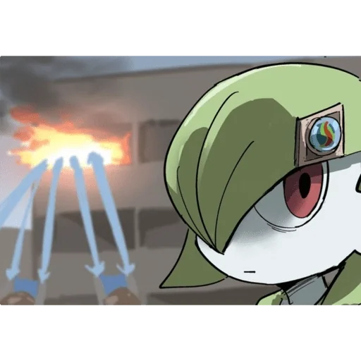 Personagem de anime com cabelo verde e um dispositivo na testa, olho vermelho, em frente a uma cena de explosão com três objetos voadores.