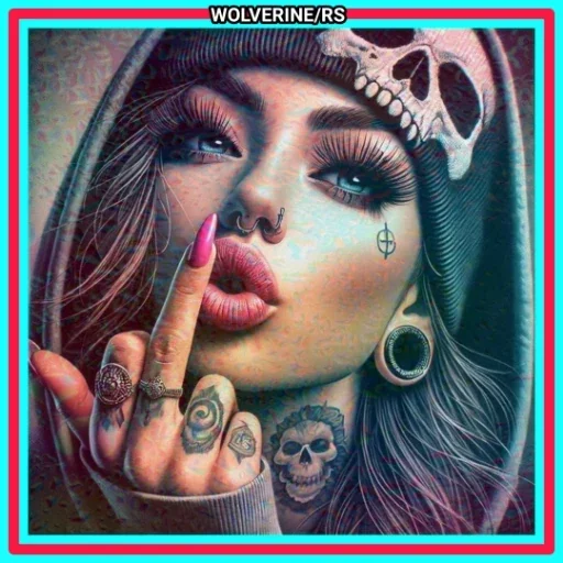 Uma mulher com tatuagens e piercings, usando um boné com um crânio, fazendo um gesto com o dedo indicador. Ela tem unha pintada de rosa e uma expressão sensual.