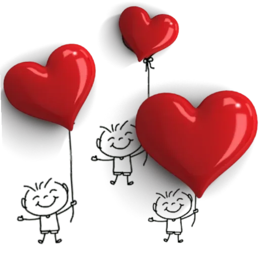 Três pessoas de desenho animado com balões em forma de coração vermelho, sorrindo e com os braços abertos.