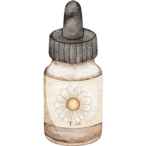 Uma garrafa de vidro com rótulo de flor branca e tampa cinza.