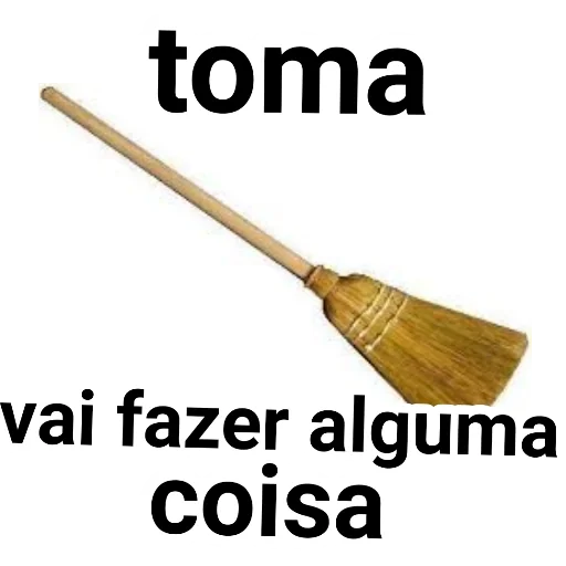 Uma vassoura amarela com cabo de madeira e o texto 'vá varrer um quintal!' em letras pretas.