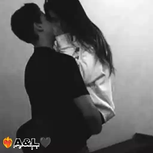 Um casal se beijando, o homem de preto e a mulher de branco, com um fundo cinza. Há um logo 'A&L' no canto inferior esquerdo.