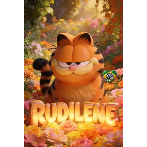 Gato Garfield com expressão séria em um jardim florido, com o nome 'RUDILENE' em destaque.