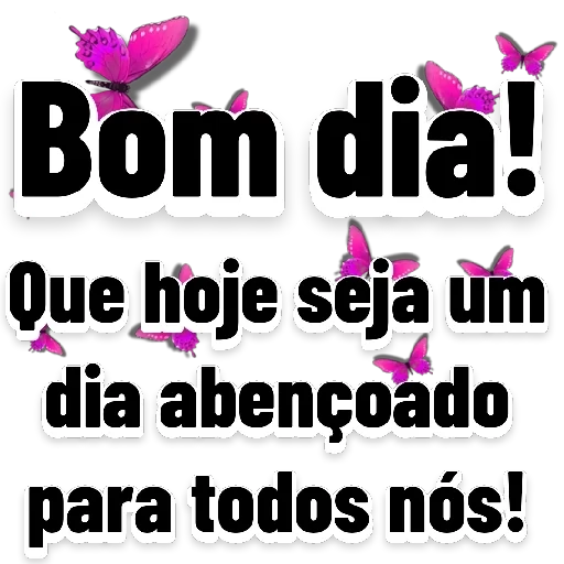 Um sticker com a frase 'Bom dia! Que hoje seja um dia abençoado para todos nós!' em letras pretas grandes, com borboletas rosa voando ao redor das palavras.