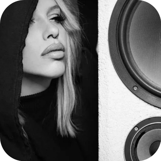 Uma mulher loira com expressão séria ao lado de duas caixas de som.