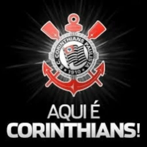 Um símbolo do Corinthians com uma âncora vermelha e um escudo com linhas pretas, com o texto 'AQUI É CORINTHIANS!' em branco.