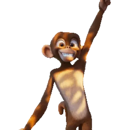 Um macaco com expressão feliz e braço levantado.
