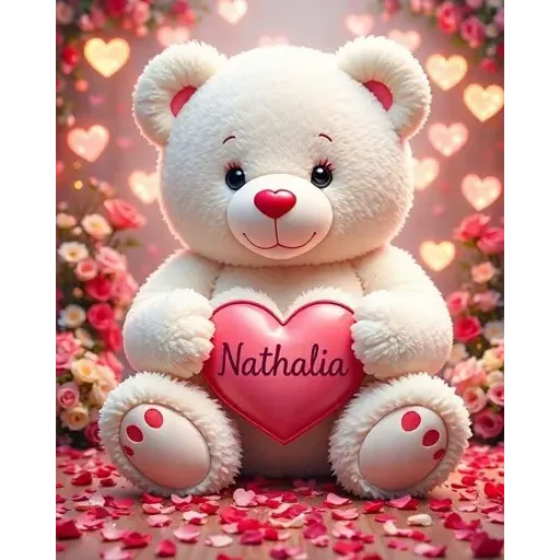 Um ursinho de pelúcia branco com olhos pretos e nariz rosa, segurando um coração rosa com o nome 'Nathalia' escrito. O fundo é decorado com flores e corações.