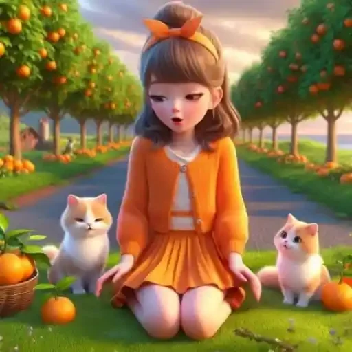 Menina com cabelo castanho e faixa laranja sentada no chão com dois gatos ao lado, em um pomar de laranjas. Ela veste uma saia e jaqueta laranja.