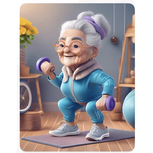 Uma avó idosa com cabelo grisalho e óculos fazendo exercícios com halteres roxos em uma academia. Ela está vestida com um conjunto azul e tênis branco.