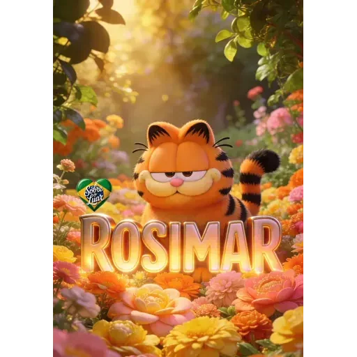 Gato Garfield com expressão relaxada em um jardim florido com o nome 'ROSIMAR' em destaque.