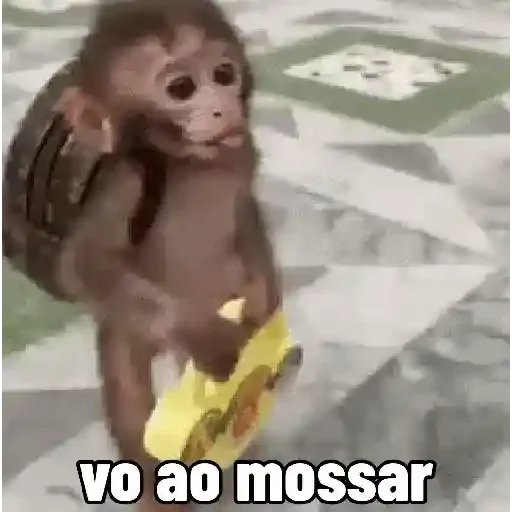 Um macaco com mochila e um brinquedo amarelo, com a frase 'vo ao mossar' na parte inferior.