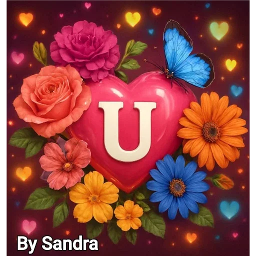 Um coração rosa com a letra 'U' em branco, rodeado de flores coloridas, incluindo rosas e margaridas, com um borboleta azul e corações pequenos ao fundo. O texto 'By Sandra' aparece no canto inferior esquerdo.