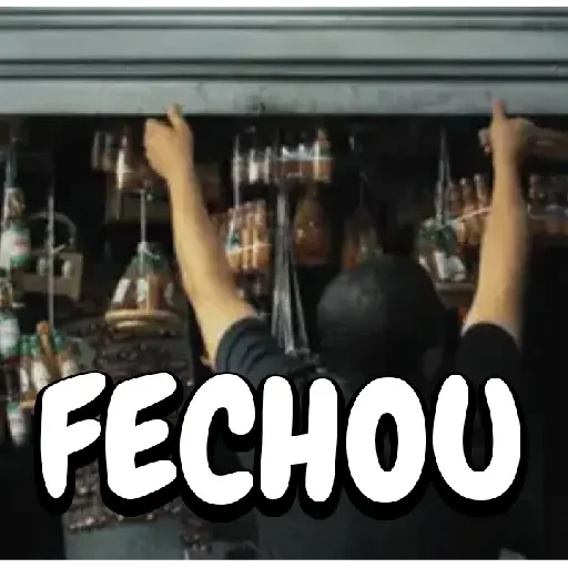 Um homem de costas, com as mãos levantadas, em frente a uma prateleira com vários objetos. A palavra 'FECHOU' está escrita em letras grandes e brancas na parte inferior.