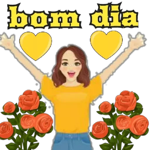 Uma mulher de cabelo castanho com um sorriso, vestida de amarelo e azul, com rosas e corações ao redor, e "bom dia" escrito acima.