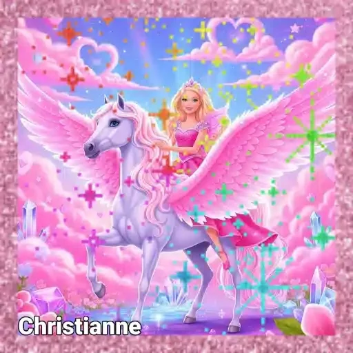 Uma princesa loira com vestido rosa está sentada em um cavalo branco com asas rosa, em um cenário de nuvens e estrelas coloridas. O nome 'Christianne' aparece no canto inferior esquerdo.