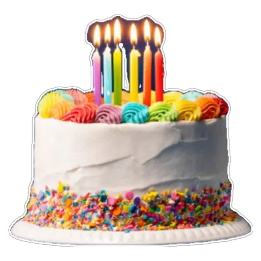 Bolo branco com confeitos coloridos na base e rosca de cores no topo, com 7 velas acesas.