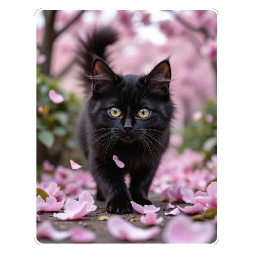 Gato preto com olhos verdes caminhando em meio a pétalas de flores rosa.