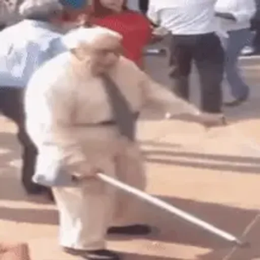 Um homem mais velho com um casaco branco e gravata cinza, parecendo dançar ou se mover de forma engraçada, segura um objeto longo, possivelmente um taco ou vara, em uma cena ao ar livre com outras pessoas ao fundo.