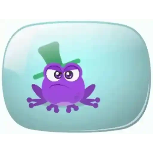 Um monstrinho roxo com expressão triste e um chapéu verde em uma bolha azul.