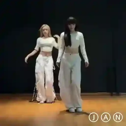 Duas mulheres dançando, vestidas com roupas brancas, em um fundo preto. A mulher da direita tem o cabelo preto e a da esquerda loiro.