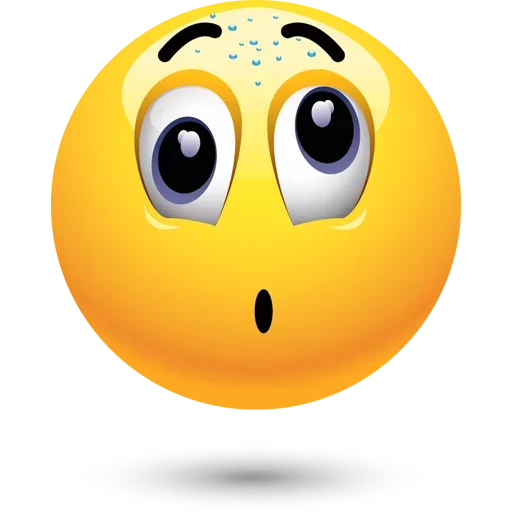 Um emoji amarelo com olhos arregalados e sobrancelhas levantadas, parecendo surpreso ou confuso, com algumas gotículas azuis na testa.
