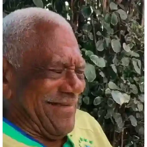 Um homem idoso sorrindo, com cabelo grisalho e óculos, vestindo uma camisa amarela com colarinho verde e azul.