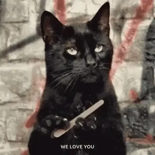 Gato preto com olhos claros, com uma faca na pata, em frente a uma parede de tijolos com marcas de sangue. Abaixo do gato, o texto 'WE LOVE YOU'.