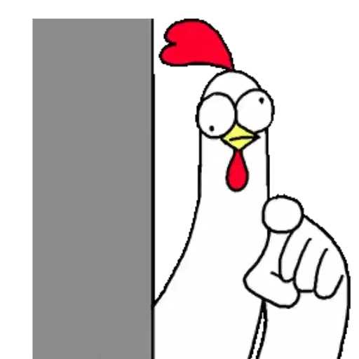 Um desenho de um frango branco com crista vermelha e olhos arregalados, mostrando-se por trás de uma barra cinza, com a língua para fora e uma expressão surpresa.
