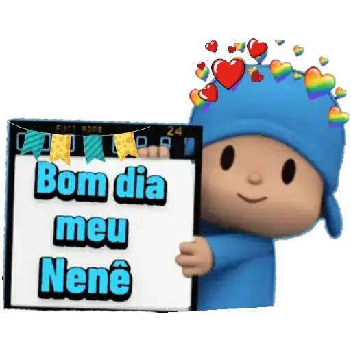 Um personagem de desenho animado vestindo uma roupa e touca azuis, com corações coloridos na cabeça, segura um quadro branco com a mensagem 'Bom dia meu Nene'.