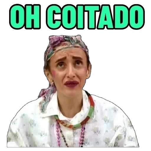 Uma mulher com expressão surpresa ou chocada, usando um lenço na cabeça e várias pulseiras coloridas. A imagem tem o texto 'OH COITADO' em letras grandes e verdes.