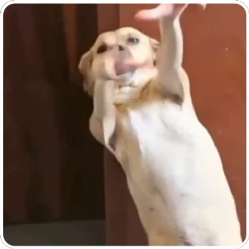 Cachorro com a pata levantada e expressão curiosa, ao lado de uma cortina marrom.