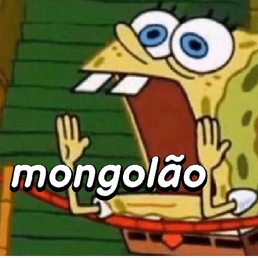 EspongeBob com a boca aberta e as mãos levantadas, parecendo surpreso ou assustado, com o texto 'mongolão' sobreposto.