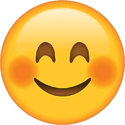 Emoticon amarelo com bochechas rosadas e sorriso largo, olhos fechados com sobrancelhas para cima.