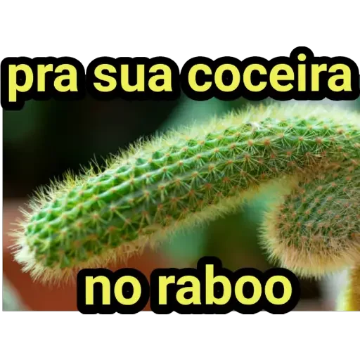 Um cacto com espinhos verdes e uma expressão engraçada, com o texto 'pra sua coceira no raboo' sobreposto.