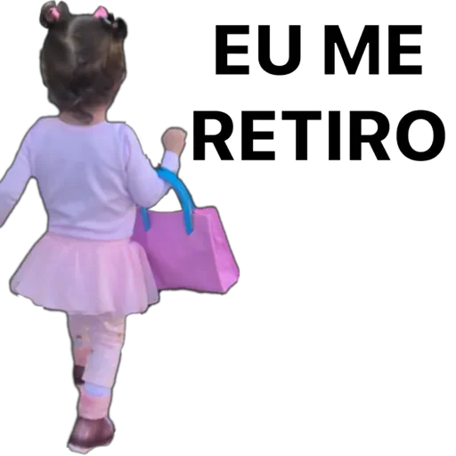 Menina de costas, vestida de rosa, carregando uma bolsa rosa e um boneco, com o texto 'EU ME RETIRO' em preto.