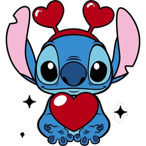 Dois personagens de Lilo & Stitch, um azul e um rosa, abraçando um coração vermelho em frente a um fundo de coração…
